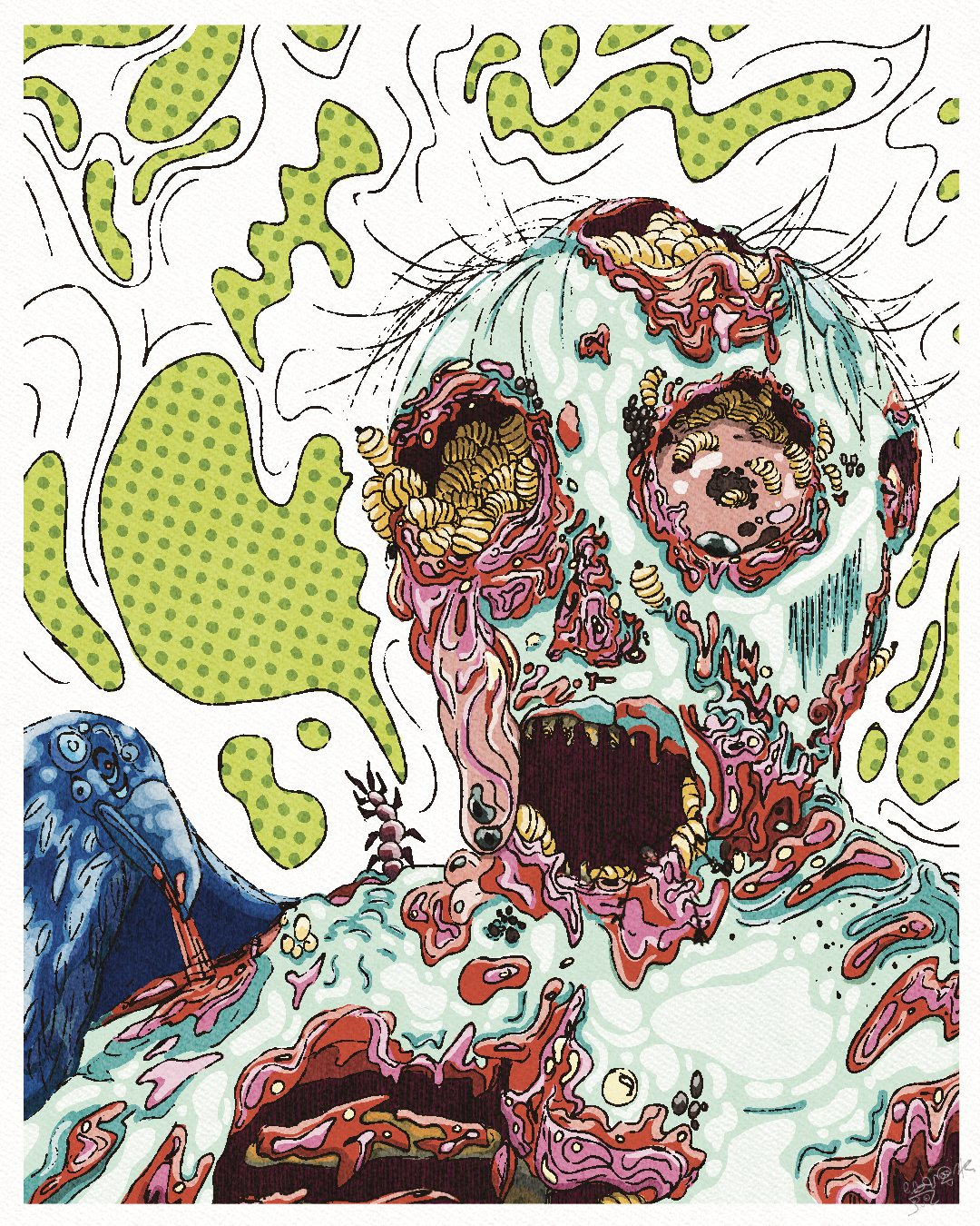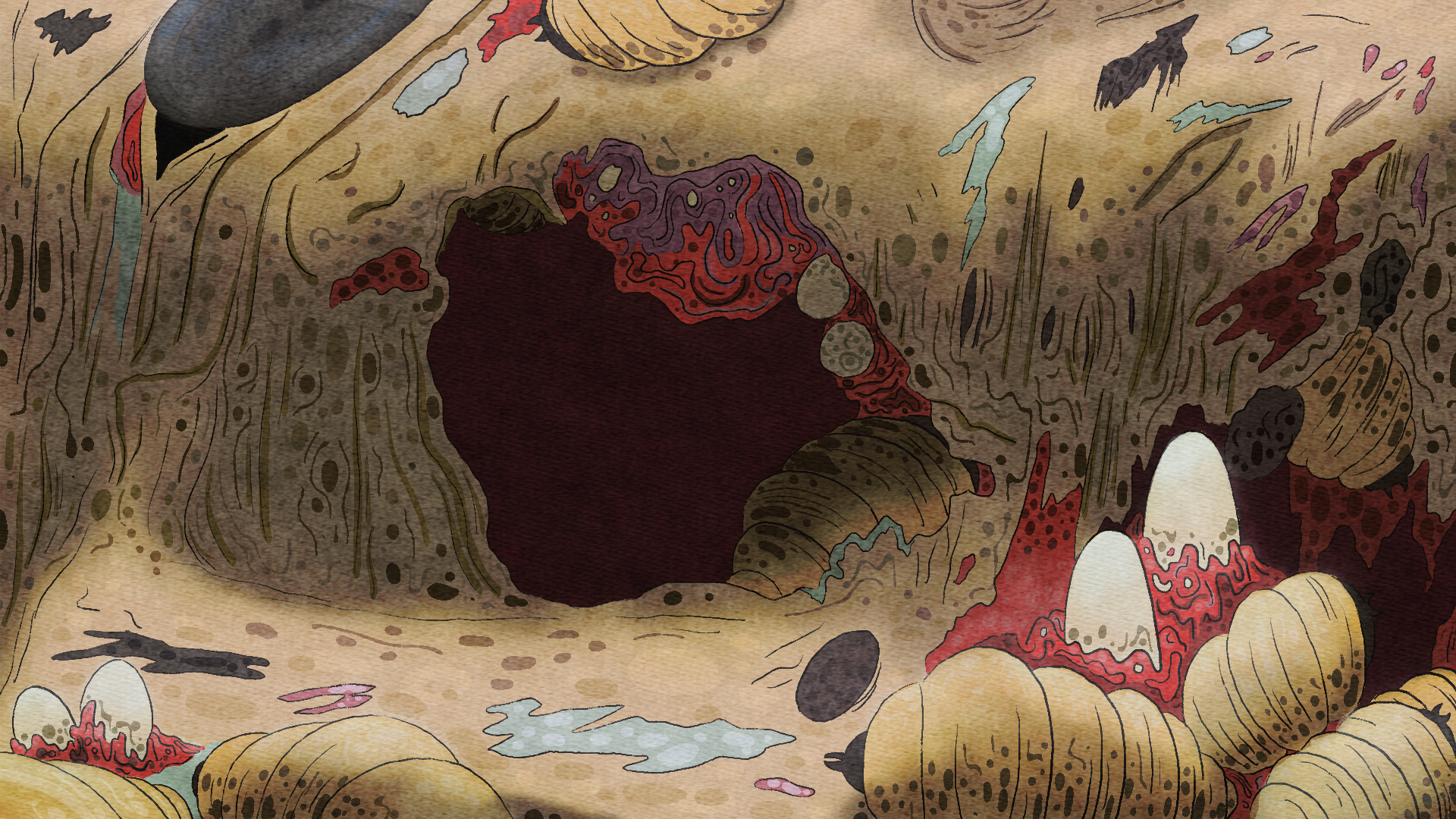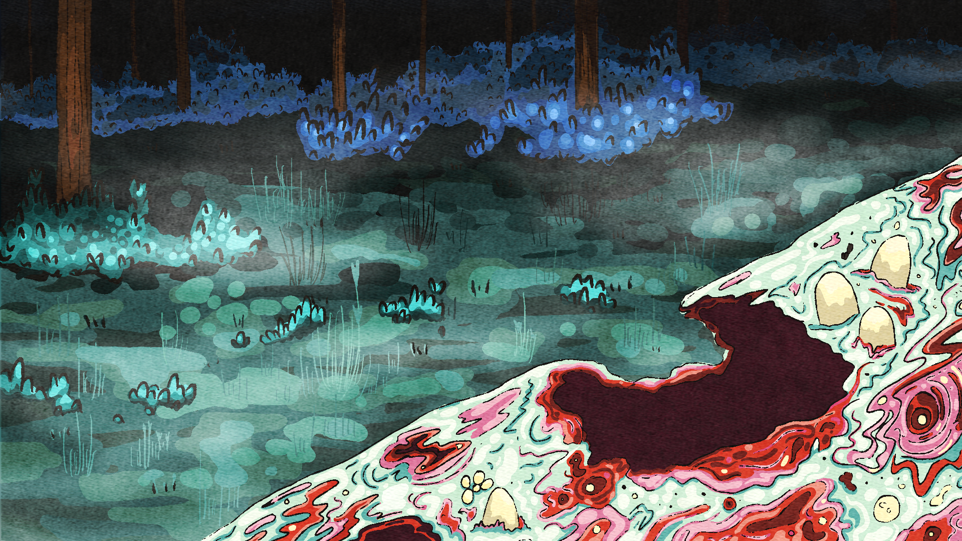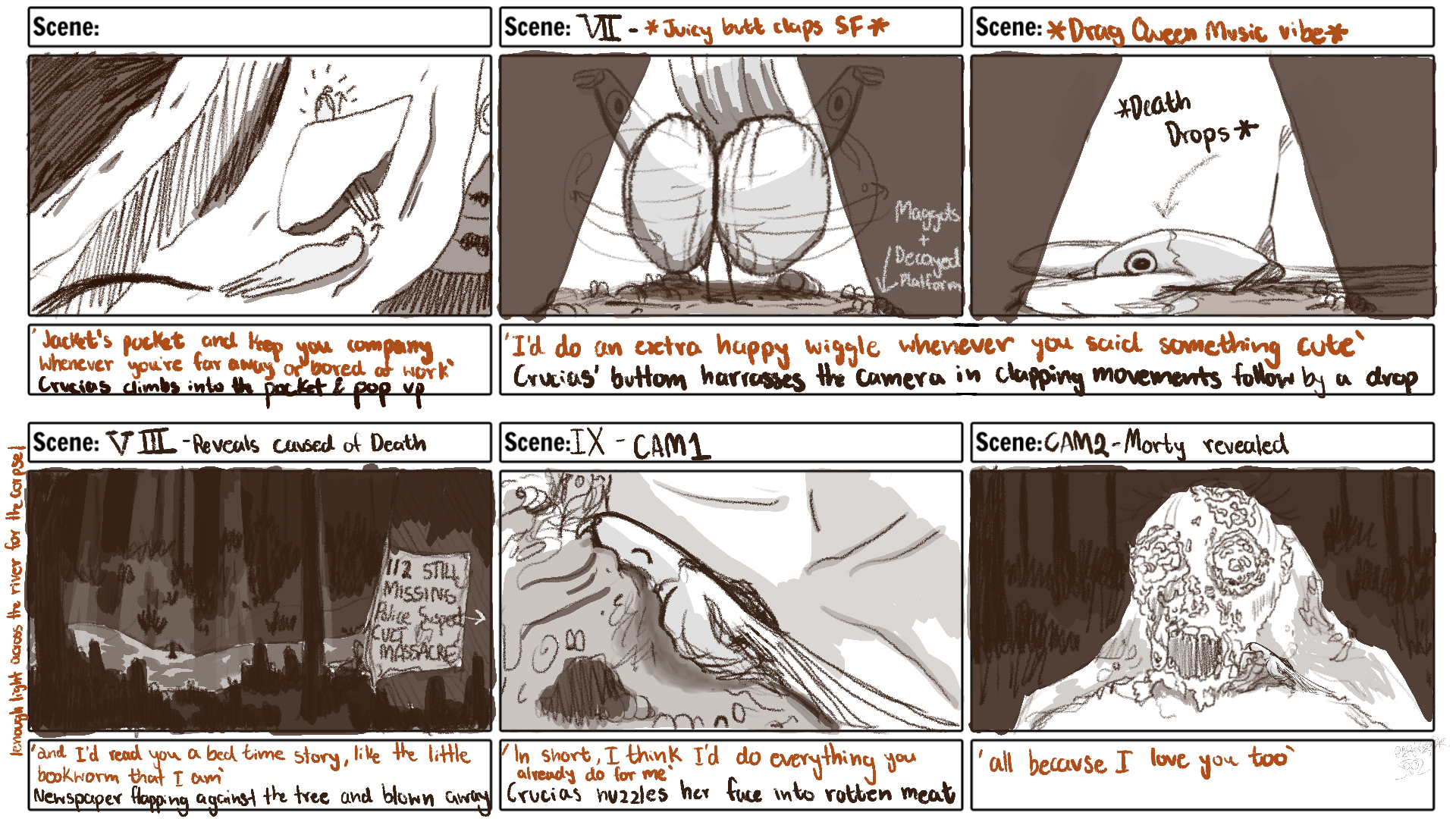 "Deep in the forest, a rotting corpse by the river is being eaten by maggots. An Eurasian Magpie who passed by arrived and started eating the maggots. She soon slowly develop feelings toward the dead body under the romantic moonlight and finally falls asleep next to moving maggots and her “lover”."